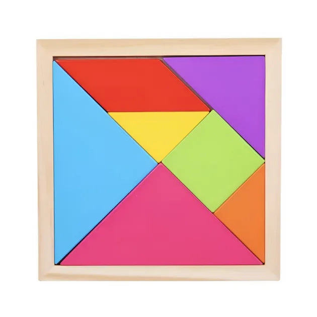 Bright multi-colored wooden tangram set with 7 chunky geometric pieces in a square frame. Kids can solve the base puzzle or create endless shapes, animals and objects using their imagination. Great for building problem-solving skills, color recognition, and hand-eye coordination. Perfect as a quiet learning toy for home or classroom.